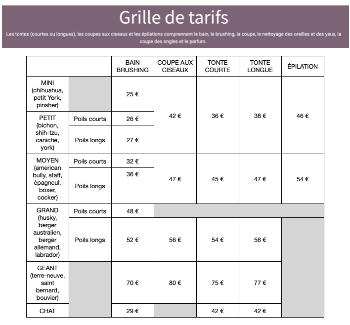 Les tontes (courtes ou longues), les coupes aux ciseaux et les épilations comprennent le bain, le brushing, la coupe, le nettoyage des oreilles et des yeux, la coupe des ongles et le parfum.
